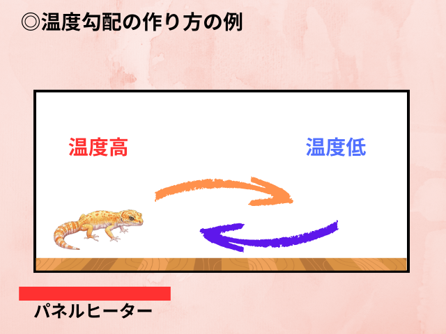- レオパが適温を選べるように温度勾配をつける